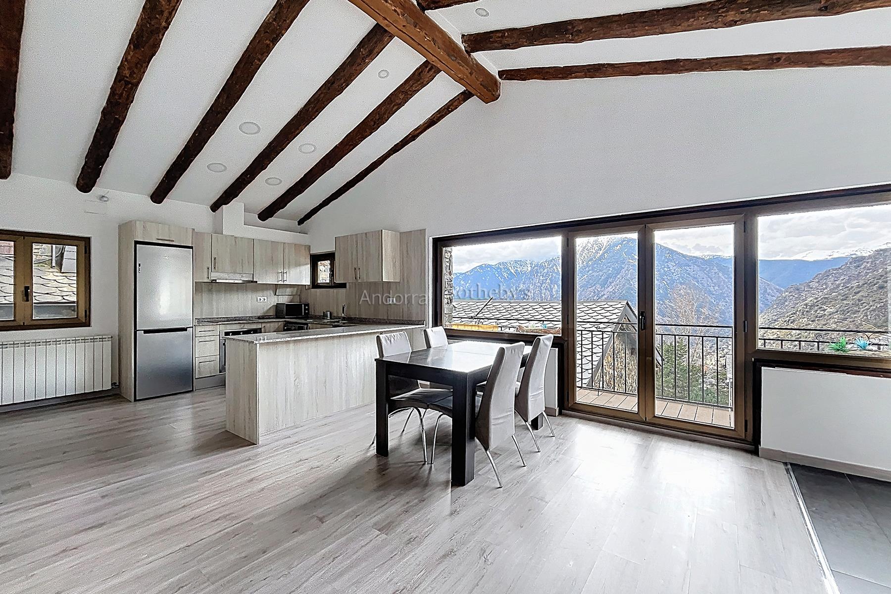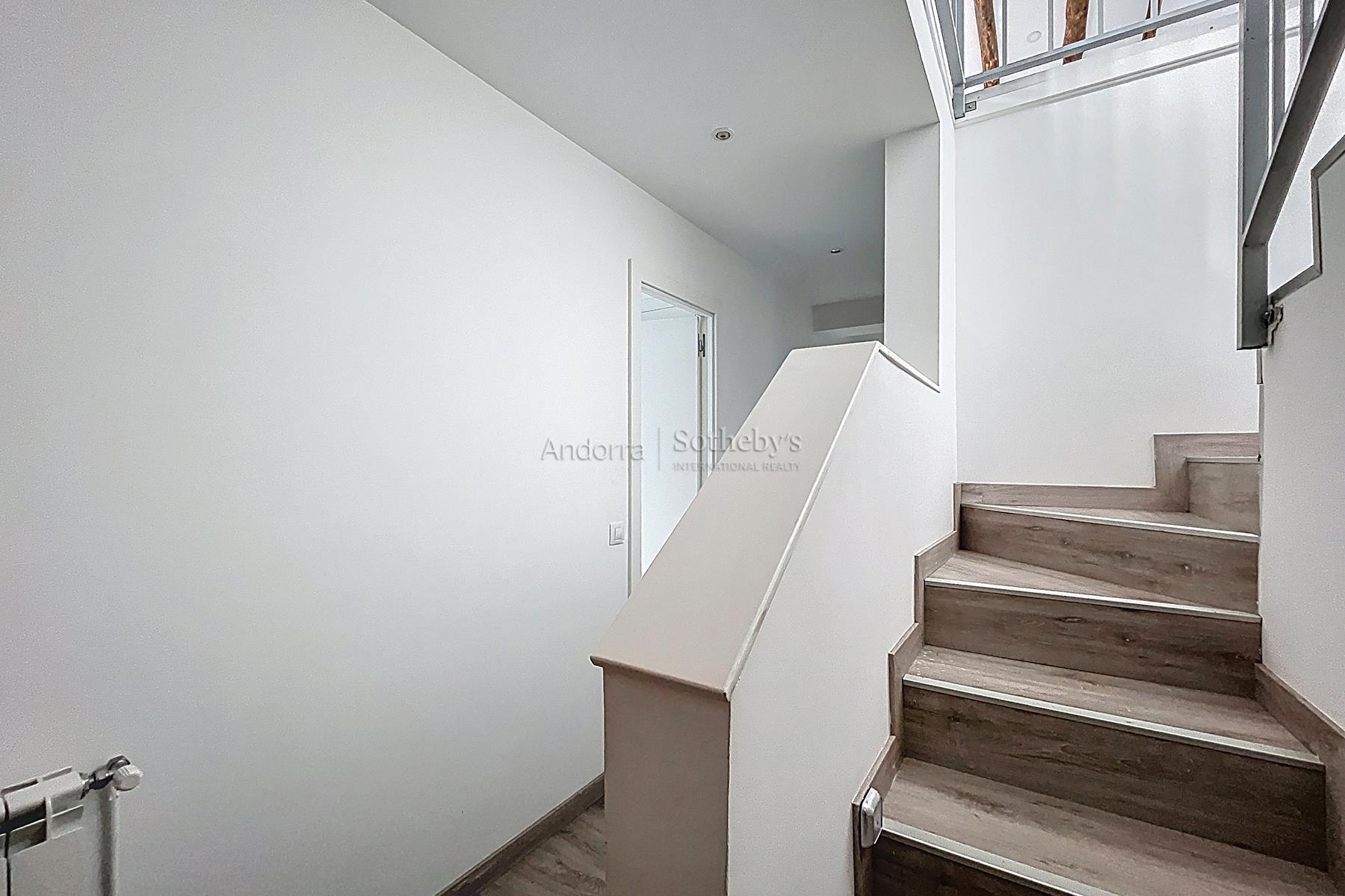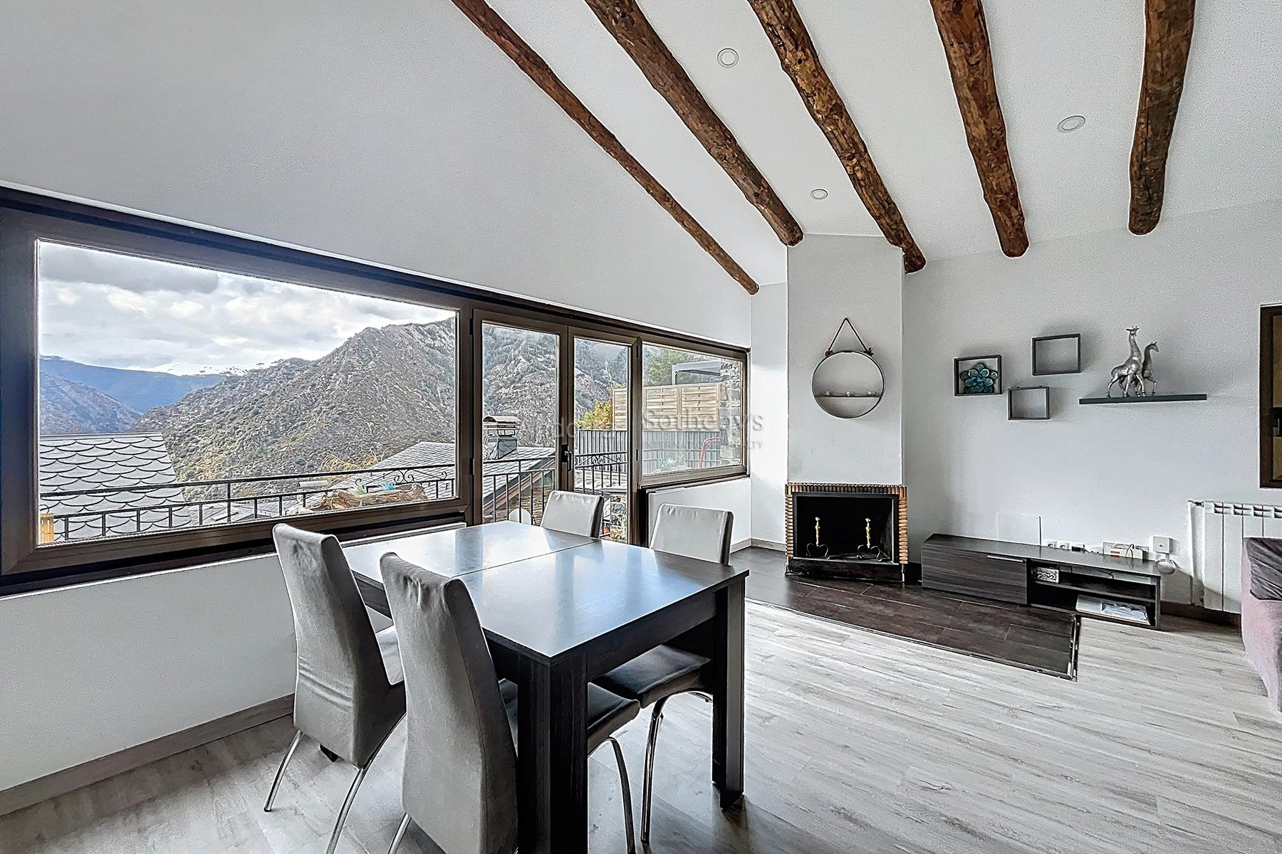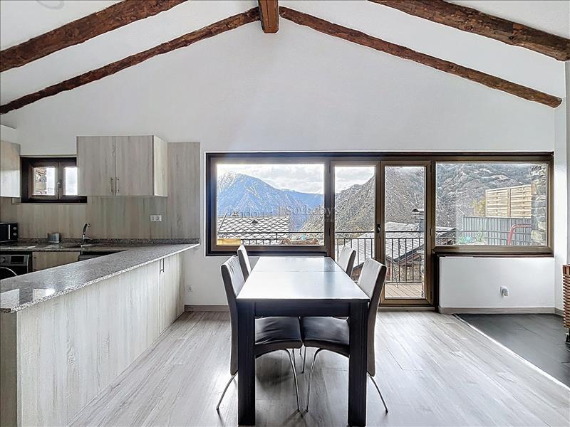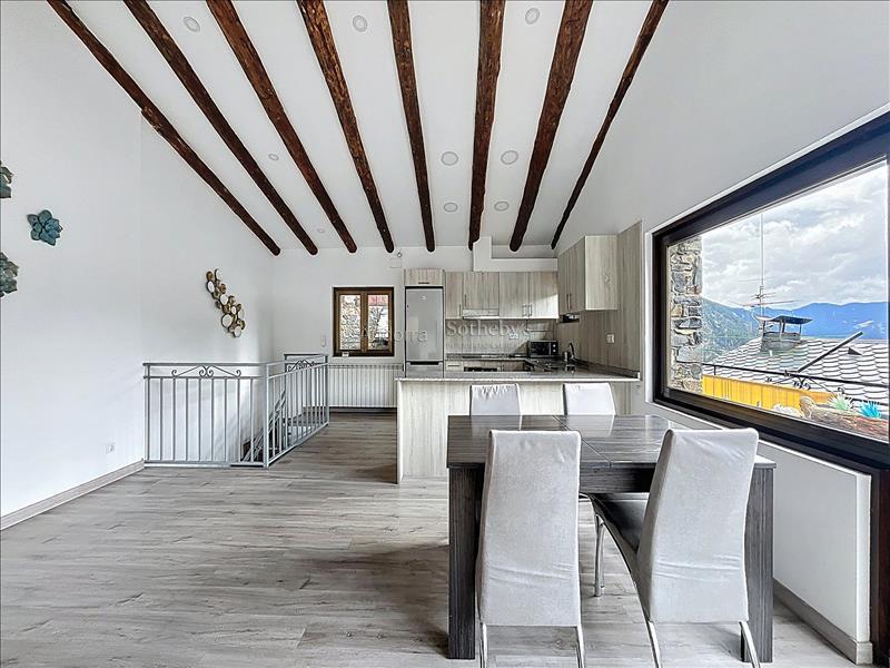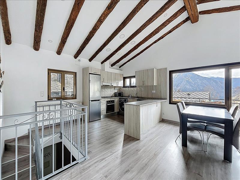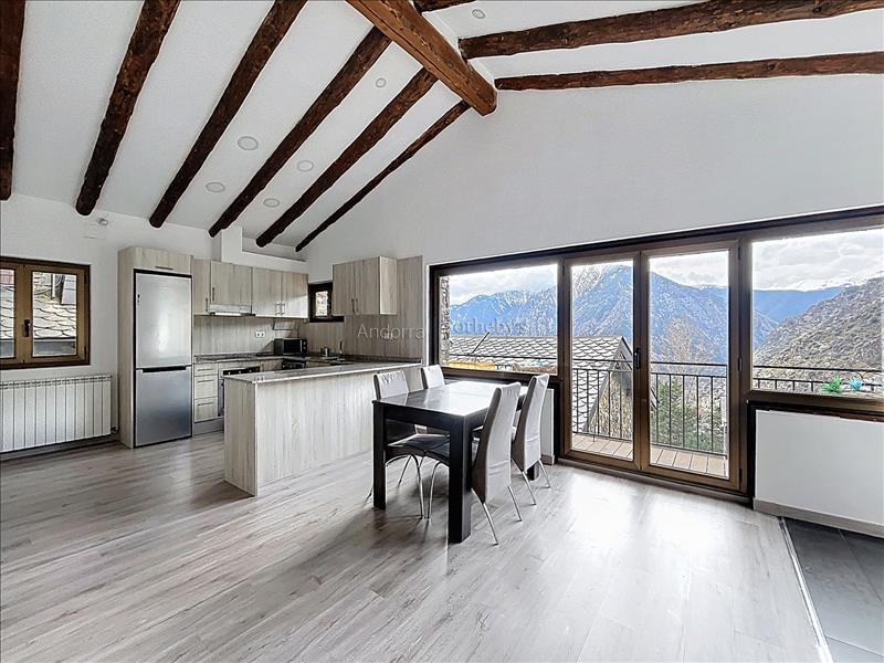 Aquesta propietat es troba en una urbanització molt tranquil·la i envoltada de natura, a pocs minuts en cotxe del centre d'Andorra la Vella i Escaldes. La propietat disposa de 115m2 distribuïts en 2 plantes. A la planta inferior hi trobem la zona de nit, aquesta distribuïda en 3 dormitoris dobles (un d'ells en suite) i un segon bany complet. A la planta superior hi ha la zona de dia distribuïda en una cuina oberta i un ampli saló menjador amb sortida a una terrassa de 9m2 amb unes vistes espectaculars a tota la vall, i molta llum natural gràcies a la seva orientació. Aquesta propietat disposa de traster en box.Característiques
