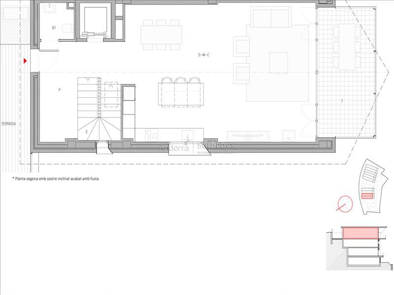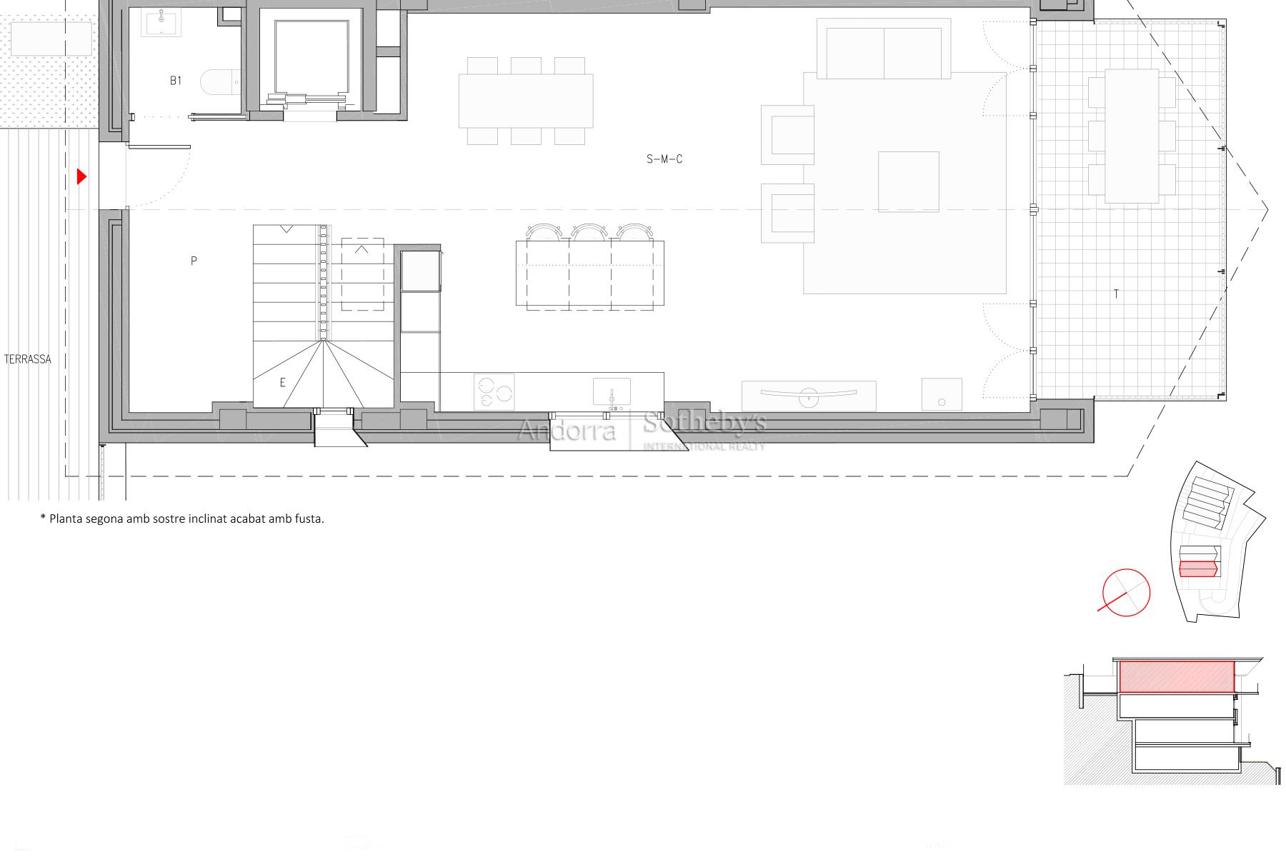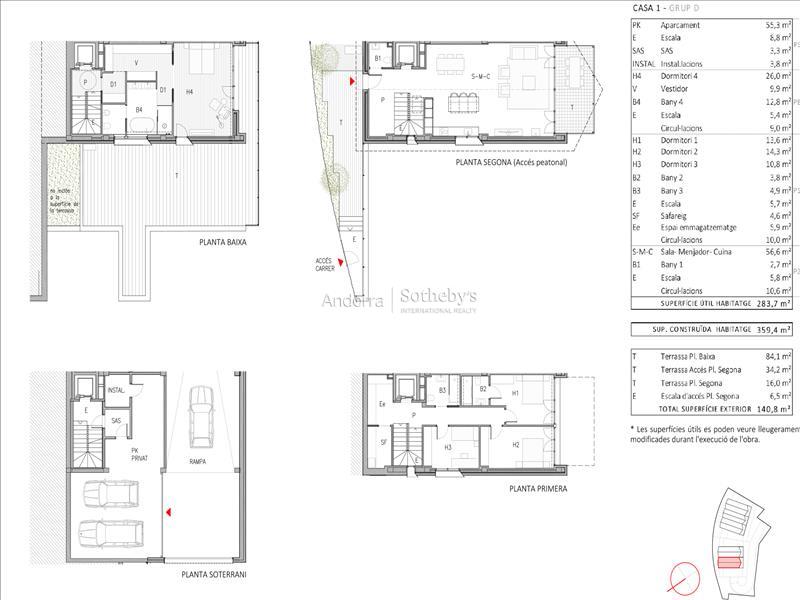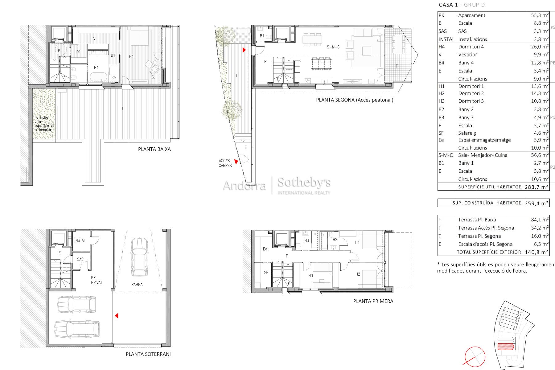 獨特的新住宅位於 La Pleta del Solà del Tarter,這裡是最受歡迎的住宅區之一,因為它靠近 Grandvalira 滑雪場,並且擁有優越的自然環境。 該房屋的建築面積為 359.4 平方米,其中可居住面積為 283.7 平方米,外部面積為 140.8 平方米,分佈在幾個露台上:一個露台 84.1 平方米,另一個露台 34.2 平方米,一個露台 16 平方米,外部樓梯 6.5 平方米。 這棟房子有四間臥室和四間浴室,提供寬敞、明亮的舒適空間。日間區域包括一個帶開放式廚房的起居室-餐廳,非常適合營造一個綜合而實用的環境。它還擁有獨立的洗衣區和 55 平方米的封閉式車庫,可容納多輛汽車。 該住宅擁有優質的裝潢和現代的建築風格,旨在與環境融為一體,充分利用自然光線和景觀。 *在工作執行過程中,可用表面可能會略有修改。特征