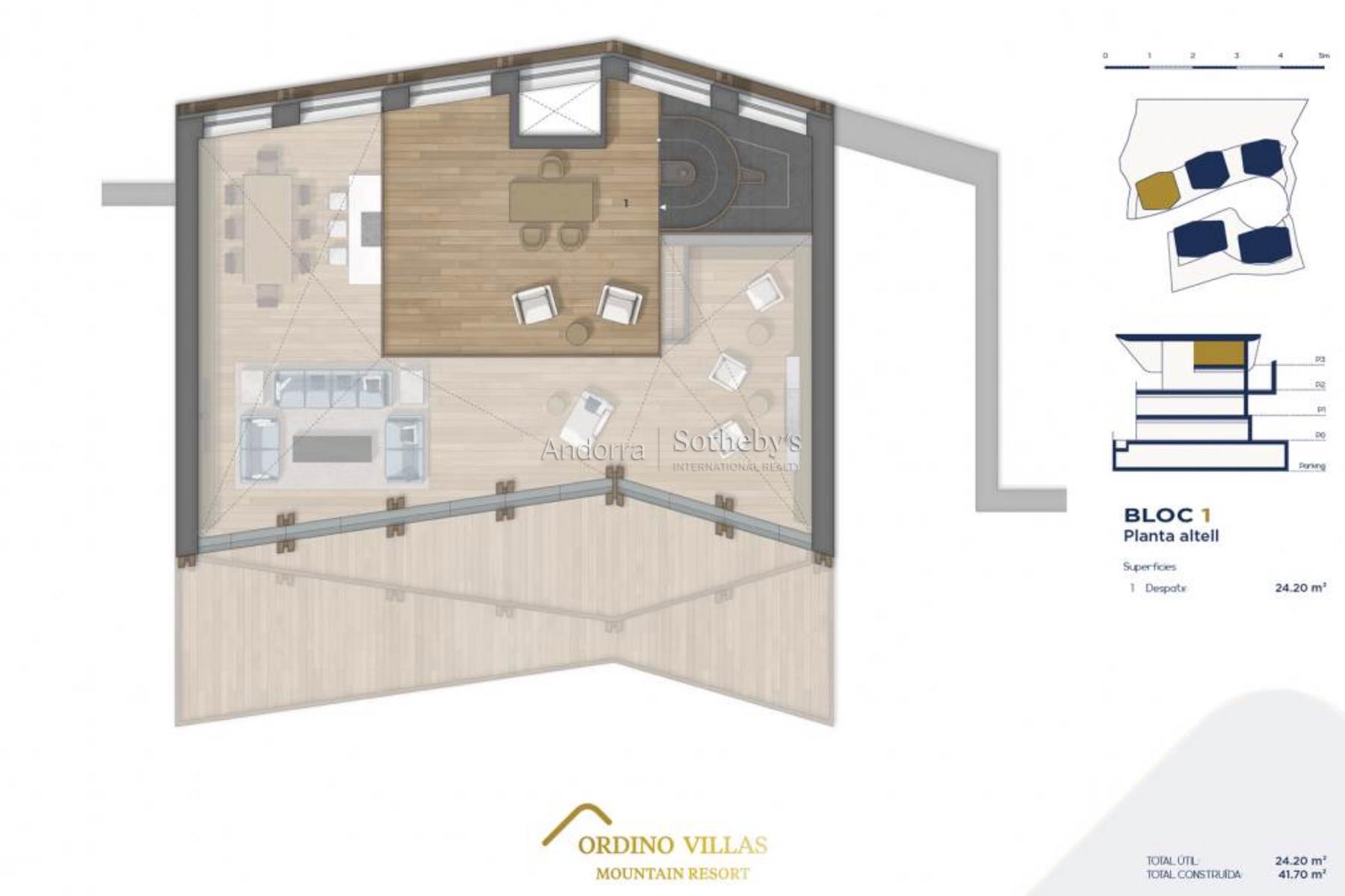 Exclusivo chalet para comprar en el encantador pueblo de Ordino, el primer destino del Principado de Andorra nombrado como Reserva de la Biosfera. Esta sensacional propiedad forma parte de una promoción de obra nueva que destaca por su privilegiada ubicación a la vez que por su lujoso diseño, ideado por el prestigioso estudio de arquitectura Rafael De La-Hoz Arquitectos. Se trata de un inmueble de nueva construcción de aproximadamente 588 m² construidos, los cuales incluyen múltiples terrazas orientadas de manera óptima para aportar la máxima exposición posible a la luz natural, y disfrutar a su vez de las magníficas vistas de Ordino y sus valles. La planta baja está destinada a la desconexión, y por ello cuenta con una increíble piscina interior con zona de spa y gimnasio, además de una sala de cine. En esta planta se encuentran además dos habitaciones dobles en suite con baño completo, un aseo y una zona de almacenamiento. En la primera planta se encuentra la continuación de la zona de descanso, con dos habitaciones en suite con baño completo, y la master suite de la propiedad, con vestidor y baño completo. Todas las habitaciones tienen salida a la terraza. La segunda planta está distribuida en una gran cocina con isla central, equipada con las últimas tecnologías, y abierta a un acogedor comedor con acceso a la terraza. En esta zona se encuentra igualmente un salón y una biblioteca, ambos espacios también con salida a la terraza, un aseo y una zona de lavandería. En la última planta, bajo tejado, se ubica un funcional despacho. Los acabados son elegantes y de la más alta calidad, y el diseño de la propiedad combina elementos modernos, como las grandes vidrieras, con la clásica arquitectura andorrana en piedra y madera para integrarse de la mejor manera en el entorno y no perder la esencia del país.Características