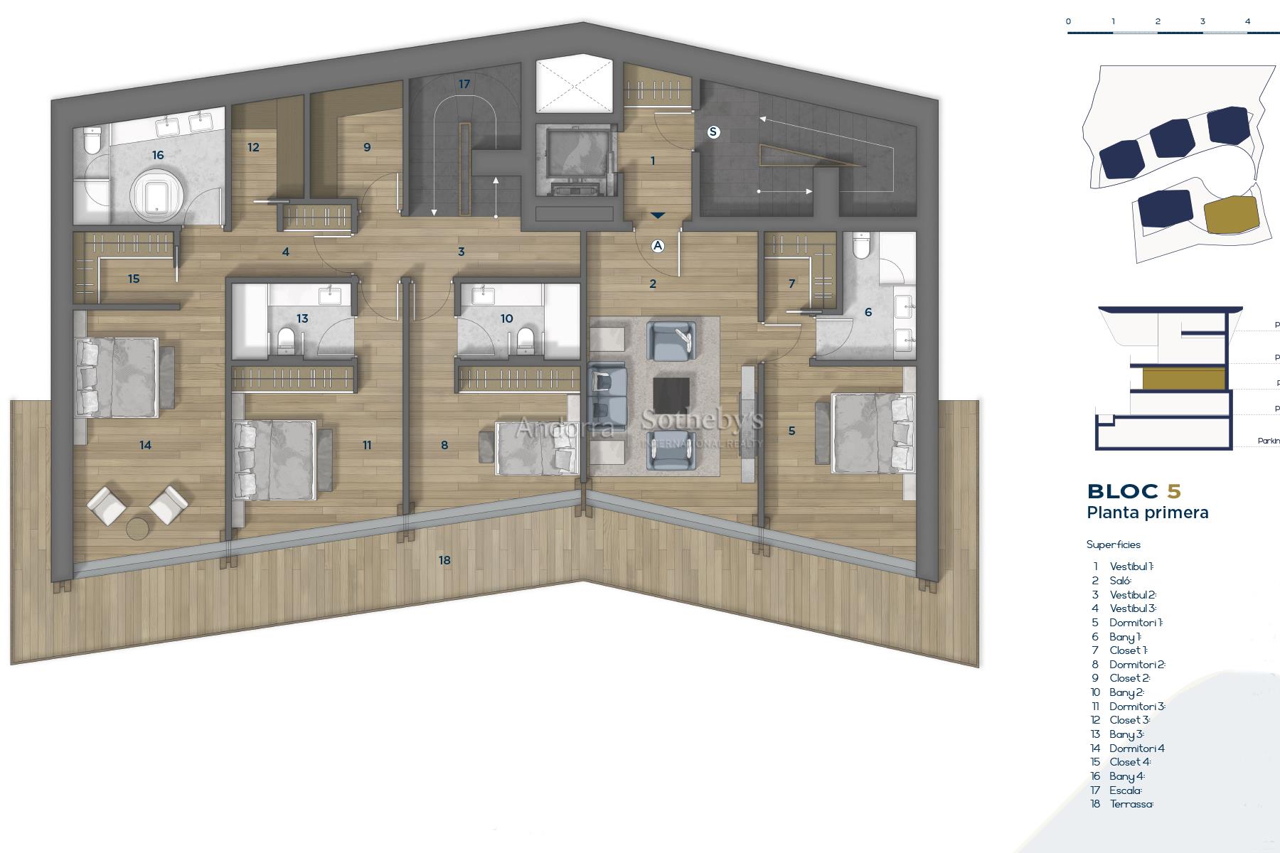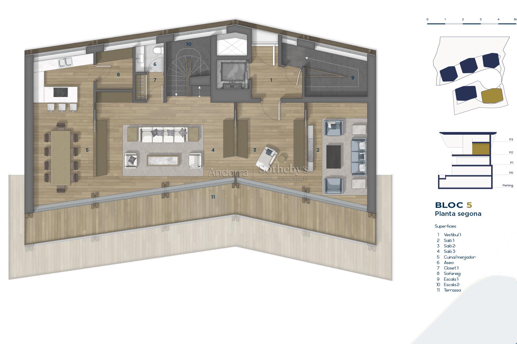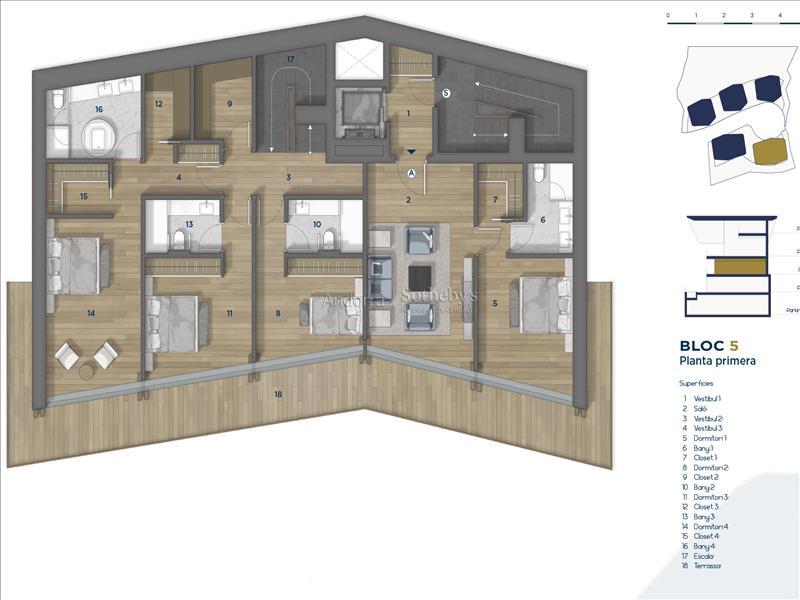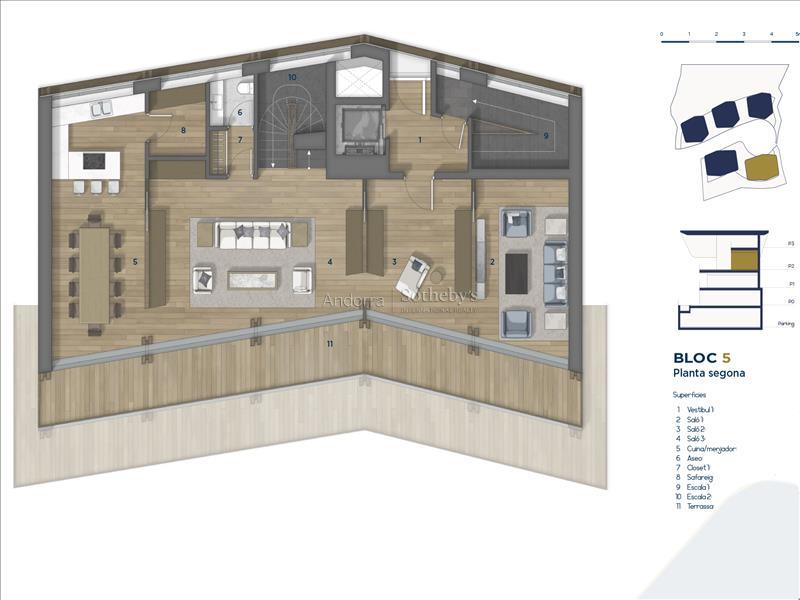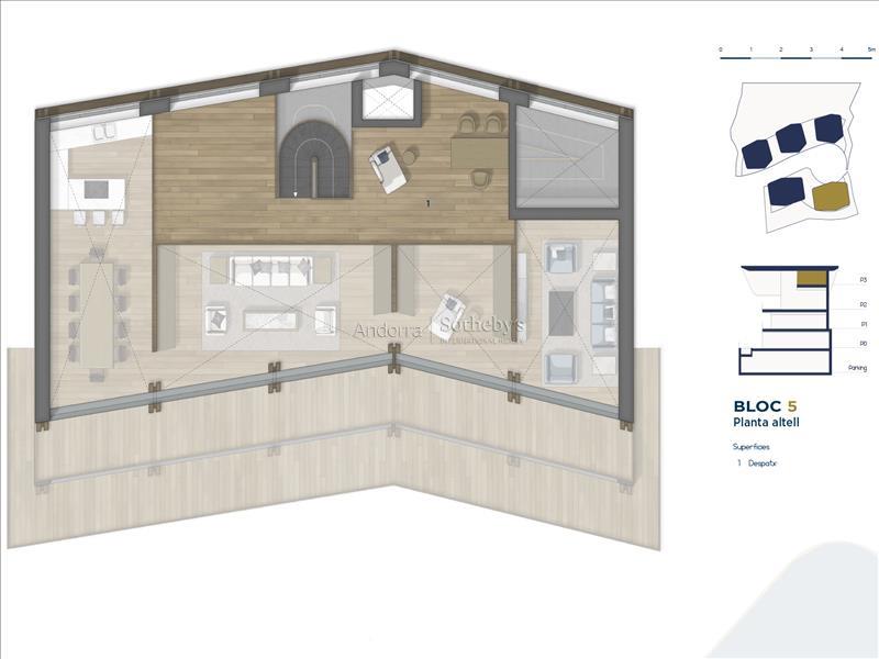 Эксклюзивный шале на продажу в очаровательной деревне Ордино, первом месте в княжестве Андорра, признанном биосферным заповедником. Эта сенсационная собственность является частью нового строительства, которое выделяется своим привилегированным местоположением, а также роскошным дизайном, разработанным престижной архитектурной фирмой Rafael De la-Hoz Arquitectes. Это новостройка площадью около 669 м², в которую входят несколько террас, оптимально ориентированных для максимального естественного освещения и для наслаждения великолепными видами на Ордино и его долины. Первый этаж предназначен для отдыха и включает в себя спа-зону и тренажерный зал, а также кинотеатр. На этом этаже находятся две двухместные спальни с ванной комнатой, гостевой туалет и зона хранения, а также большая терраса. На втором этаже продолжается зона отдыха с двумя спальнями с ванными комнатами и мастер-люксом с гардеробной и ванной комнатой. Все спальни имеют выход на террасу. Третий этаж состоит из большой кухни с центральным островом, оборудованной новейшими технологиями и открытой к уютной столовой с выходом на террасу. В этой зоне также находятся гостиная и библиотека, оба помещения также имеют выход на террасу, туалет для гостей и прачечная. На последнем, мансардном этаже располагается функциональный офис. Недвижимость имеет 8 парковочных мест по 11,5 м² каждое, всего около 706 м² парковки. Отделка выполнена в элегантном и высококачественном стилевом решении, а дизайн недвижимости сочетает современные элементы, такие как большие оконные проёмы, с классической андоррской архитектурой из камня и дерева, чтобы гармонично вписаться в окружающую среду и сохранить сущность страны.Особенности